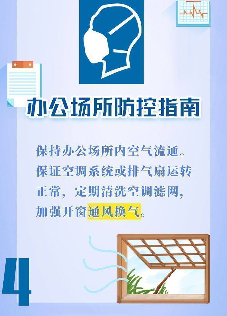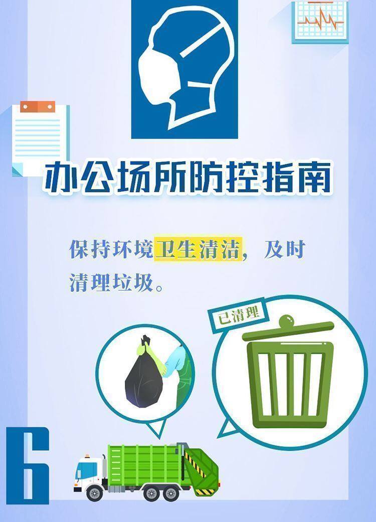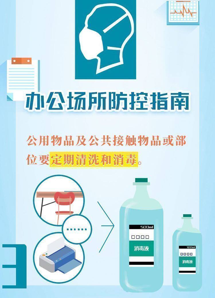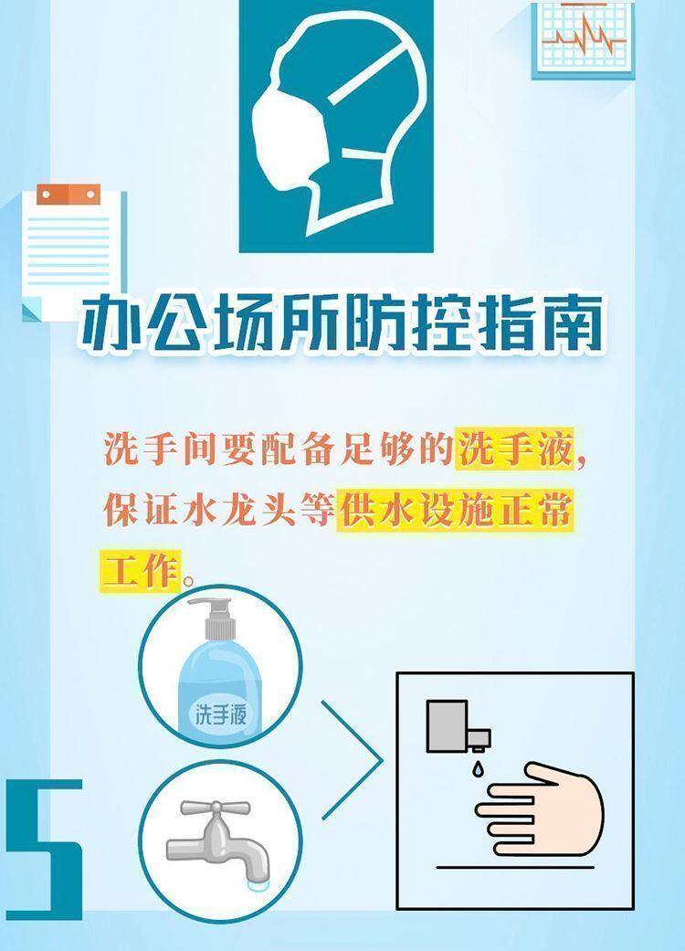 保持办公区环境清洁,建议每日通风3次,每次20-30分钟,通风时注意保暖。人与人之间保持一定的距离,多人办公时佩戴口罩。保持勤洗手、多饮水,坚持在进食前、如厕后按照六步法严格洗手。接待外来人员双方佩戴口罩。